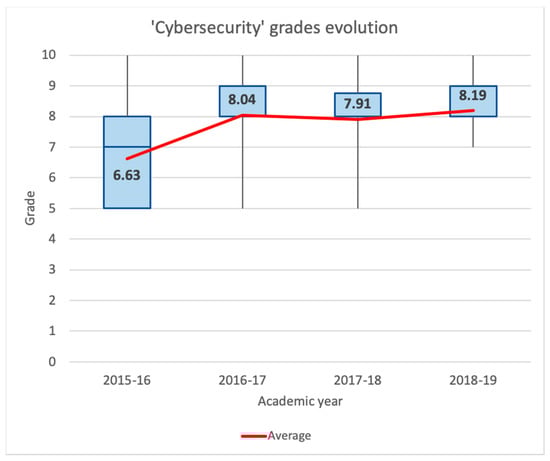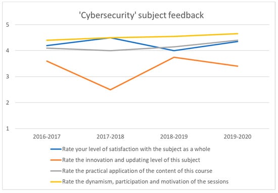The feedback results of the ‘Cybersecurity’ subject shown in Figure 17, are between 4 and 5, apart from the innovation rate. These results show how students are very satisfied with the subject. There was also a turning point regarding the innovation of the subject in the course 2017–2018. In this sense, the subject was updated the following year, and the feedback results significantly improved the following year. The practical application of the content is highly rated, and the mark grows year after year. Additionally, the methodology is very well rated, starting at 4.4 four years ago, and increasing year after year.
