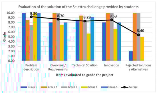 The grades obtained for the items evaluated are presented in Figure 14, differentiated by groups. Moreover, the average for each item is shown. All the groups presented a correct description of the problem and, especially, three of them fully understood and explained the Selettra challenge, obtaining an average mark of 9.20. There was also a good perception of the requirements that the solution to be provided by the students must meet, with an average grade of 8.70. Each group suggested an appropriate technical solution, explaining the technologies, systems and resources necessary to carry it out (average mark of 8.29). Only one group did not elaborate on the technical explanation of their solution and therefore obtained a regular grade of 5.70. The proposed solutions have a high degree of innovation (average mark of 8.53), using new generation technologies and advanced systems. Finally, only two groups made an appropriate analysis of possible solutions, and presented the pros and cons of each one, justifying their final decision, causing a low average rating of 5.40 on this item. The time to present the solution was quite limited, and the groups that were fairer in time possibly focused on those parts of the solution with a higher weighting (leaving the alternatives for the end without being able to solve them with good quality). Nevertheless, knowing how to divide the work effort to obtain the maximum profit if there are limitations (like time) is also important.