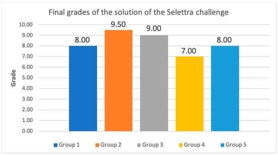 The final grades of the project are shown in Figure 15. These grades represent a solid acquisition of objectives. Four groups obtained a grade of 8 or higher. Only one group was evaluated below 8. Probably, this group was negatively affected by not having any student from the Smart Cities postgraduate program: a student profile that provided an interesting point of view regarding the viability of the solution and innovation to the rest of the groups.