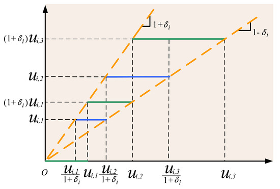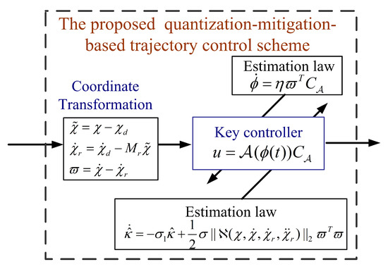 where , , and are design constants, and are initially chosen as and . For better clarification, we depict the proposed quantization-mitigation-based trajectory control in Figure 3.