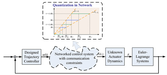Considering that the parameters including , , and in (5) are unknown to the designer, we call (5) unknown quantized actuator dynamics. It is noted that Equation (1), together with (5), is capable of modelling several equipment and devices communicating through networks including the teleoperated robot systems, unmanned vehicular systems, and sensor networks. The quantized actuator dynamics for networked Euler-Lagrange systems are shown in Figure 2.