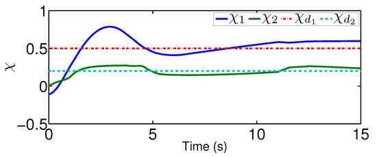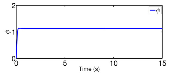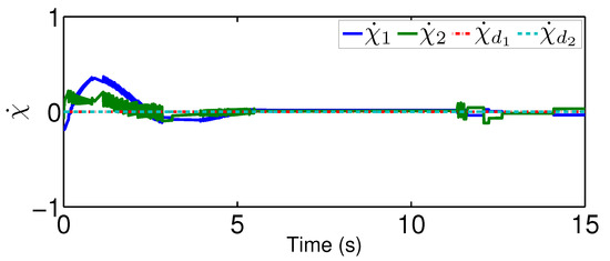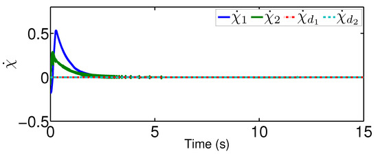 Now, we focus on the boundedness of the terms on the right-hand side of (32). From the above-mentioned analysis, one obtains that the signals , , and are bounded. As an immediate result, the integral term on the right-hand side of (32) must exist and be finite. In addition, it is further obtained that the derivative of the signal is bounded. Subsequently, it follows from Barbalat’s Lemma that , which ensures that .