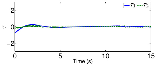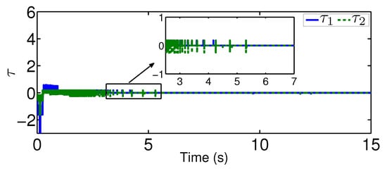 For the comparison, we test a fuzzy controller in [35], which uses the fuzzy logic systems to handle the system dynamics but does not contain an adaptive mechanism to reject unknown quantized actuator dynamics. Please note that we only change the controller from the proposed one to the fuzzy controller. The system dynamics, as well as the parameters for the quantization, are the same as that in the previous scenario. Under the existing fuzzy controller, the actual controller signal after the quantized actuator dynamics is plotted in Figure 10 and the actual trajectories of and are depicted in Figure 11 and Figure 12. From Figure 11, there exists a steady error in controlling quantized actuator dynamics if the existing fuzzy controller is used. This confirms that the strong nonlinearities arising from the quantized actuator dynamics severely affect the system performance. Comparing the results in Figure 8 and Figure 9 and in Figure 11 and Figure 12, one concludes that the proposed quantization-mitigation-based method works better than the existing controller for the trajectory control of networked Euler-Lagrange systems.