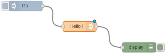 According to their role in the information flow, nodes are classified into three types: (i) Input nodes, which introduce information in the flow that is usually gathered from a sensor or from an incoming IP packet; (ii) Output nodes, which do not forward the information to another node but to a database (to be stored) or to a console (to be debugged), for this the message is sent as an IP packet that exits the flow; and (iii) Intermediate nodes, which are all the other nodes that receive the message (input), modify the information and send the message (ouput). Figure 2 shows an example of a simple flow with an input node, an intermediate one and an output one. When node Go is activated, a message is introduced in the flow, processed by node Hello ! and displayed in the console thanks to node display.