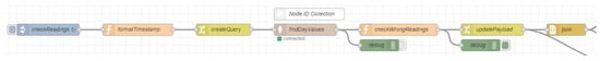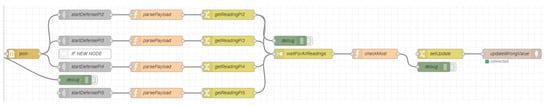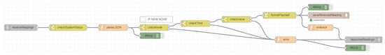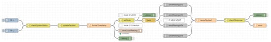 For measurement management and communication between the devices, we have used the software that is included by default in the Smartpi 2.0 by the manufacturer (Smartpi version 0.18.5 and Raspberries version 0.20.5): Node-RED [38]. This is an open-source flow-based development tool for the integration of IoT hardware devices [39], APIs and online services developed by IBM Emerging Technology. In fact, it is an adaptation of the Node.js framework and it uses a flow-based programming editor for web browsers. Therefore, a great part of the development is done graphically, rather than textually (i.e., by writing code, as usual). In general, a node receives information, processes it and sends the result to the next node. The basic unit of information, called a message, is a packet that is transmitted from one node to the next one and contains the information that needs to be processed, as well as any information added by the user and some metadata. Since Node-RED is based on Node.js, we are essentially dealing with JavaScript objects that can be converted to JSON. Messages have the following basic fields: (i) _msgid, a random identifier for each message created; (ii) topic, a property used for fragmenting and reassembling messages; and (iii) payload, the content of the message.