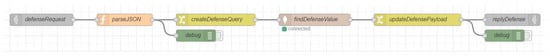 The script has two invocation parameters, –start_date and –end_date, in yyyy-mm-dd hh:mm:ss format, specifying the time period when the consumption is set to zero. Firstly, the flows are already arranged in a JSON array where every object includes the characteristics defining the node it represents: name, type, parameters, location, connections, etc. Then the fake flow (Figure 9) is added to the first one and both flows are deployed together; because if the fake one were to be deployed on its own, the system would stop performing its original function. It will also serve as a backup to later restore the original flow without any trace of the attack. A sequence of nodes is then added to be able to modify the database.