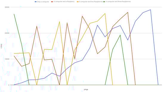 Consequently, the DoS attack has been carried out taking into account four different scenarios: one, two, three or four attackers. The first aspect we have analyzed is the ping response time, which is depicted in Figure 8 (timeouts are displayed as zeros). When the Smartpi 2.0 is not under attack, the response time is 4 ms, on average.