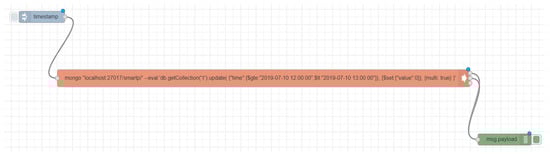 After that, the input node executes the flow. Then the exec node executes the commands of the terminal server through Node-RED. In this node, an instruction invokes a MongoDB instance and executes an update operation that sets the consumption values within the time range indicated with –start_date and –end_date to zero. Finally, a debug node is introduced. Its output will be displayed in the attackers terminal, and so will any error during the attack to the database.