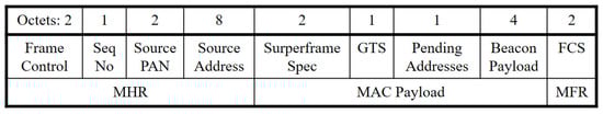 The beacon frame format is shown in Figure 2, in which the beacon payload has the form of a 4-byte positive integer with an initial offset of 0 and an increment of one each time a frame is sent. The abbreviations MHR, MFR, GTS and FCS represent MAC header, MAC footer, guaranteed time slots and frame check sequence, respectively. The receiver was also installed with Contiki OS 2.7 and a self-written receiver program designed to send the received information (e.g., the frame contents at the MAC layer, the RSSI value and the CRC outcome, to the recorder with Universal Asynchronous Receiver-Transmitter (UART) signals over a Universal Serial Bus (USB)).
