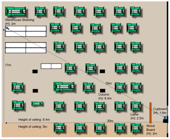 Figure 3 illustrates the basic layout of the experimental sensing field with dimensions of approximately 17 × 30 m (length × width). Although the actual dimensions of the field are approximately 100 m in length and width, only the areas related to the experiment are drawn for ease of illustration. The factory had two ceiling heights, namely 8.4 m in the majority of the building (upper part of Figure 3) and 5 m in the remainder (bottom part of Figure 3). The transmitter was located in one corner of the building (see the red dot in Figure 3) and was placed on top of a cabinet with a height of 1.6 m. There were windows behind the cabinet, and hence the transmitter was exposed to sunlight during the afternoon period of the experimental process. The transmission power was set as –1 dBm throughout the entire measurement process and the transmissions were performed using channel 25 (2474–2476 MHz). The receiver was positioned together with the recorder on a shelf with a height of approximately 2 m in the diagonally opposite corner of the building (see the blue dot in the upper-left-hand corner of Figure 3). The receiver and transmitter were separated by a distance of approximately 35 m, but were not in direct line of sight of one another due to the presence of lathe machines on the factory floor with a height of around 2.5 m. In the path between the transmitter and the receiver, except for the static obstacles, there existed lots of dynamic obstacles. The raw and semi-finished materials on the machines in the path were often moved from one machine to another by the workers. Also, some workers might often walk across the path. Thus, the number of obstacles in the transmission path was dynamic. The measurement period commenced at 15:45 on one day and ended at 15:30 the following day. During the experimental period, the lathes operated independently in accordance with their particular work orders. That is, not all of the machines worked together, and none of the machines operated over the entire experimental period. Furthermore, in the factory, the daily work content is roughly the same, although there might be slight differences. That is, a day is just a cycle. Therefore, the data measured in one day could be used to characterize the factory environment. In Reference [], the authors stated that “We collected error traces of approximately 10 million packets in a way that provides, to the authors’ best knowledge, an unprecedented level of insight into the effects of the wireless channel state on the level of corruption of packets.” By contrast, there were up to 43,728,940 transmission records collected in our experiment. According to our studies and the results presented in Reference [], this amount of data could be able to provide valuable insights into the quality of the wireless link.