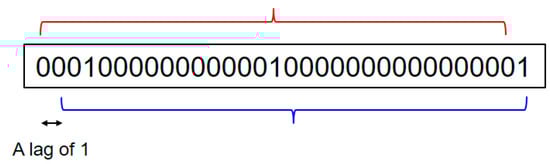 Referring to Figure 5, the FDR has its lowest value in the sixth hour of the experimental period (i.e., 21:45–22:44). In other words, the transmission quality within the factory is particularly poor during this period. As a result, the transmission records acquired in the sixth hour were scrutinized particularly carefully. In particular, the records in the corresponding pcap file were converted into binary records arranged in chronological order from left to right, as shown in Figure 6, in which values of 0 and 1 indicate that the frame transmitted at the particular time was successfully and unsuccessfully received, respectively. Note that failure cases were recorded if the corresponding frame was partially lost, or the length of the received frame was the same as that of the transmitted frame, but the received frame failed to pass the cyclic redundancy check.