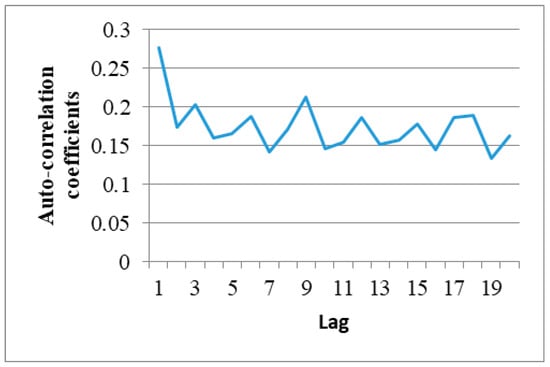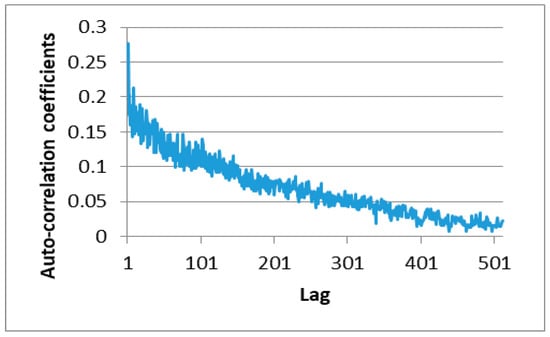 Equation (1) was then applied to determine the autocorrelation between the data corresponding to the binary record of the first minute of the sixth hour (21:45). Note that in implementing Equation (1), x and y were taken as two values in the selected trace with a certain time lag between them. For example, referring to Figure 6, the data enclosed within the lower curly bracket lag those within the upper curly bracket by a notional time value of 1. Figure 7 shows the autocorrelation coefficients computed for the data in the first minute of the selected trace. As described in Section 3, the transmitter used in the present experiments had a broadcast frequency of 512 Hz. In other words, the transmitter broadcasts 512 transmissions each second. As a result, the time lag in Figure 7 has a value of 1/512 s. In general, the results show that the data received at the receiver with a gap of 1 s have almost no correlation with each other. The autocorrelation of the data within the first 0.3 s of the time interval is around 0.1, or more. Figure 8 shows the autocorrelation of the data received over a period of 20/512 s within the first minute of the recorded trace. The above results show that the success or failure of the current transmission does depend on the previous transmission results and mainly depends on the last transmission results. Furthermore, this implies that the collected trace data could be used to train the proposed second-order Markov model, which will be elaborated in the following section.