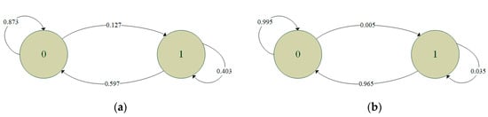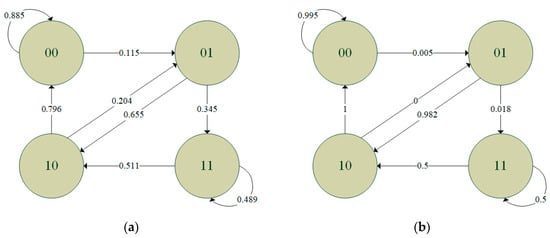 Since the transmission quality in the sixth hour is the worst among all the hours in the experimental period, while that in the tenth hour is the best (see Figure 5), the binary records of the first minutes in these two hours were used to train the independent model, the two-state Markov model and the second-order Markov model. The FDRs of the independent model derived from the two binary records were found to be 0.825 and 0.994, respectively. The training results for the two-state Markov model are shown in Figure 9, where the circles indicate the states and the digits in the circles represent the results of the previous transmission (i.e., 0: successful transmission, 1: failed transmission). In addition, the links between the circles indicate the change from the old state to the new state, where the end without an arrow is the old state and the end with an arrow is the new state. Finally, the numbers attached to the links denote the corresponding transition probabilities. Figure 10 shows the training results obtained for the second-order Markov model (note that the meanings of the symbols in Figure 10 are the same as those in Figure 9 except for the two digits in each circle, where the digit on the right indicates the result of the previous transmission, while that on the left indicates the result of the transmission before the previous one). For ease of discussion, the transition probability in the second-order Markov model is denoted as pABC, where p is the probability, AB is the old state and BC is the new state. For instance, the probability of transitioning from state 11 to state 10 is denoted as p110. From the results presented in Figure 9 and Figure 10, it is clear that the transition probabilities trained by the two datasets are very different. In other words, the results support the inference above that the parameters in the error model should be trained based on the transmission records obtained during the time intervals with similar average RSSI values.