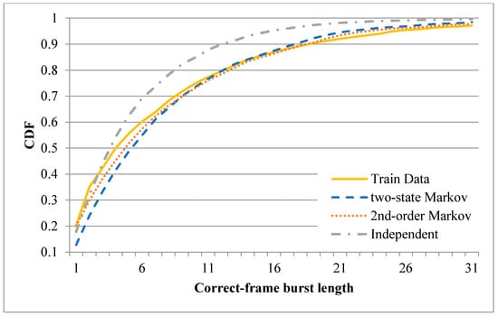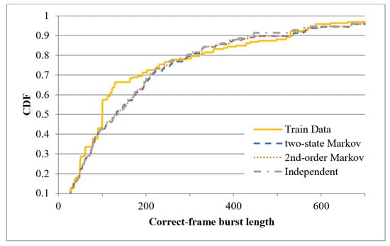 Cumulative Distribution Functions (CDFs) of correct-frame burst length derived using different error models based on recorded trace in the first minute of the sixth hour.