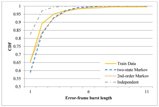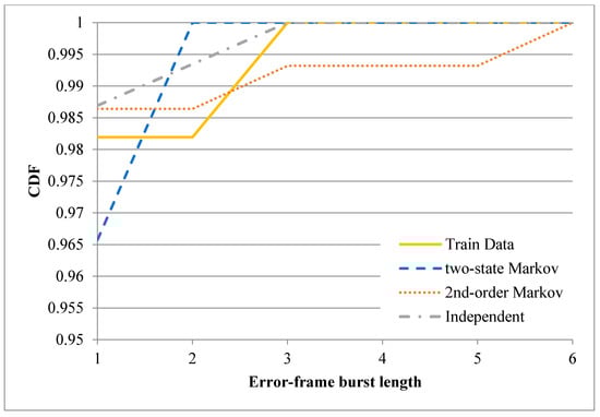 After training the three error models described above, one-minute binary records were synthesized using each of the three models (note that the starting state for the two-state Markov model was set as 0, while that for the second-order Markov model was set as 00). The CDFs of the correct-frame burst length derived from the original records and the three synthesized records are plotted in Figure 11 and Figure 12 for the first minute of the sixth hour and the first minute of the tenth hour, respectively. Figure 11 shows that the CDF of the correct-frame burst length derived using the second-order Markov model is closer to that of the correct-frame burst length derived using the original records than those derived using the independent model or two-state Markov model. However, referring to Figure 12, the three error models have a similar performance. Figure 13 and Figure 14 show the CDFs of the error-frame burst length derived from the original records and the synthesized records for the first minute of the sixth and tenth hour, respectively. It is seen in Figure 13 that the performance of the second-order Markov model is comparable to that of the two-state Markov model and is better than that of the independent model. However, for the records collected in the first minute of the tenth hour, all three models have a similar performance (see Figure 14). This finding is reasonable since the transmissions in the tenth hour have the best quality among all the traces collected in the experimental period. In other words, the trace data in the tenth hour contain only a small number of error-frame bursts for training purposes. Consequently, for all three models, the length of most error-frame bursts is equal to 1. Overall, however, the results presented in Figure 11, Figure 12, Figure 13 and Figure 14 show that the proposed second-order Markov error model outperforms both the independent model and the two-state Markov model when the transmission quality is poor.