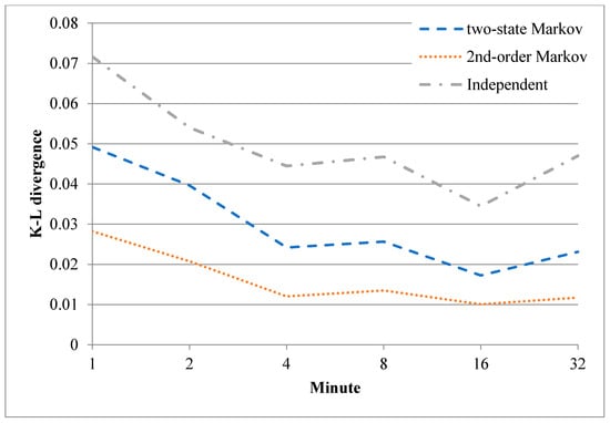 As described above, the lack of error-frame bursts in the trace limits the ability of the trained error models to describe the error-frame bursts in the real environment. To address this problem, a further training process was performed using additional experimental traces. In particular, the trace data of the first 2n minutes of the sixth hour were used to retrain the three models, where n is an integer ranging from 0 to 5. The authenticity of the resulting error models was quantified by computing the Kullback-Leibler (K-L) divergence [] of the synthesized data relative to the original records, i.e.,