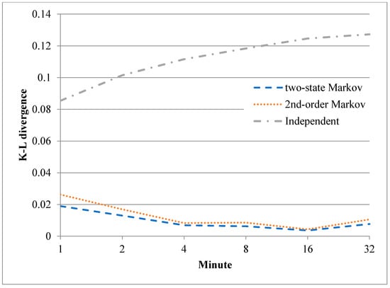 Figure 15 and Figure 16 show the results obtained for the K-L divergence between the correct-frame bursts and error-frame bursts of the original records and those of the synthetic data produced by the three error models, respectively (note that for both figures, the plotted data show the average values obtained over 100 computation processes performed with different synthetic data). As shown in Figure 15, the divergence of all three models reduces (i.e., the authenticity of the models increases) as a greater number of original records are employed in the training process for the correct-frame bursts. A similar tendency is noted for the two Markov models for the error-frame bursts, as shown in Figure 16. However, for both training processes, the divergence improves only very slightly as the length of the training data is increased beyond 4 min. It is additionally noted in Figure 16 that the independent model performs poorly in capturing error-frame bursts in lossy environments.