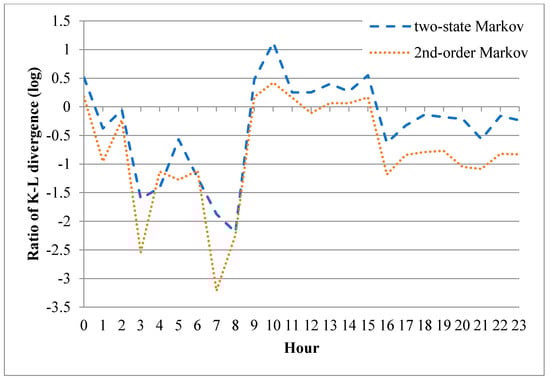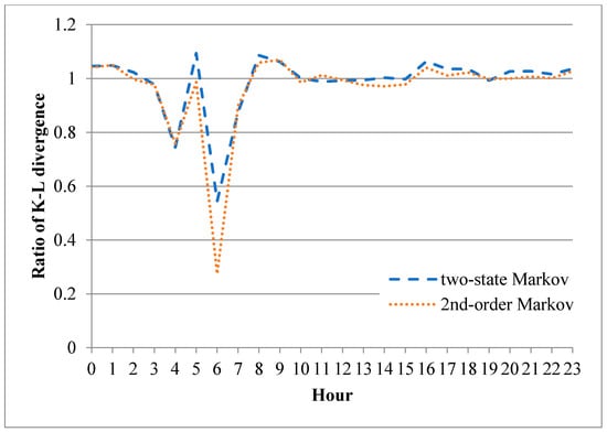 K-L divergence ratios of Markov error models for correct-frame bursts in each hour of the experimental period.