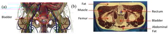 (a) Anatomy of the pelvic cavity showing the bladder’s location; (b) axial computer tomography (CT) scan of the pelvic cavity presenting the nature and location of the tissues.