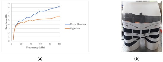 (a) Reactance of the pelvic phantom compared to the pig skin; (b) manikin wearing a boxer underwear incorporating flexible electrodes for bioimpedance measurement.