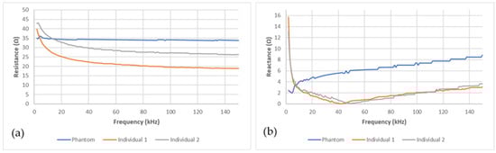 Comparison between the phantom’s (blue line) (a) resistance and (b) reactance and the human ones (grey and red lines).