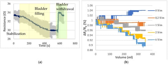 (a) Bladder filling and withdrawal recording; (b) resistance variations recorded with the different solutions presented by Table 2.