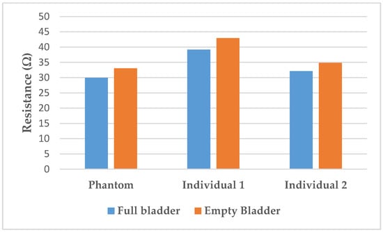 The resistance variation corresponding to the 350 mL filling of the bladder with artificial urine on the lab bench is 9.3 ± 0.3%. In the human subjects, variations of 9.7% for individual 1 and 8.5% for individual 2 were calculated. Those variations are illustrated in Figure 8.