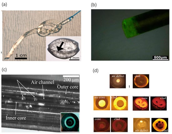 For example, a biodegradable optical fiber made of cellulose that embodies optical, microfluidic and drug release functions has been fabricated via thermal drawing [29]. The geometry presents a porous double-cladding, in which the inner core is suspended in the middle of an outer cladding by the intact powder particles. The clear internal structure profile can be clearly seen in Figure 2c. Sensing by using these fibers relies on changes of fiber transmission properties when fiber pores are filled with analyte. The easily tailored design of the structure of these fibers can support many applications such as optical imaging, PBM and biosensing. An intriguing possibility is to incorporate optical, sensing and medical treatment functionalities into the same biocompatible fiber to create a highly integrated and self-sufficient medical system for theranostics [29].