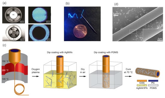 To achieve electrophysiological recording and optical neuromodulation co-instantaneously, a class of hybrid fiber maintaining low optical loss has been characterized as a flexible polymer-based fiber coated with silver nanowires meshes [54]. In this design, silver nanowires (AgNWs) and PDMS are respectively dip-coated as the cladding in sequence for electrophysiological recording and protection. The structure of this flexible fiber and the light transmission therein is shown in Figure 4b. These fibers may, in the future, be tailored to address fundamental problems in spinal cord or visceral organ neurophysiology [54]. Typical fabrication process involving the assembly of the preform and fiber drawing process is illustrated in Figure 4c [54]. Besides, quantum dots (QDs)-doped polymer microfibers have growing wide applications in photomedicine due to the excellent properties, such as adjustable emission wavelengths and photochemical stability. For instance, a novel QDs-doped polymer microfiber (Figure 4d) has been fabricated via thermal drawing using the polystyrene mixed with the PMMA [55]. Under light excitation from the focused laser, the polymer fiber can function as optical sensors, and can serve as a waveguide for phototherapy [55].