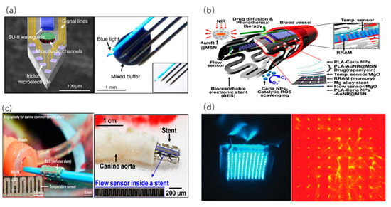 - Son, D.; Lee, J.; Lee, D.J.; Ghaffari, R.; Yun, S.; Kim, S.J.; Lee, J.E.; Cho, H.R.; Yoon, S.; Yang, S.; et al. Bioresorbable electronic stent integrated with therapeutic nanoparticles for endovascular diseases. ACS Nano 2015, 9, 5937–5946. [Google Scholar] [CrossRef]