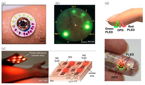 In another study, a type of ultrathin skin-like systems has been used in pulse oxygenation measurement based on the principle of photoluminescence [81]. After light transmission in the body, the red and green light-emitting from the PLEDs can be detected by the OLED. Through this way, the voltage related to light intensity can be displayed. Figure 7d shows a photograph of a finger wearing the ultra-flexible organic optical sensor. Owing to the extremely flexible, compact and efficient optical structure, the device with high precision in monitoring the situation of the patients can assist the treatment of disease. Notably, laminated on the pre-stretched acrylic tape–silicone rubber sheet, the center OLED is neatly accompanied by two PLEDs [81].