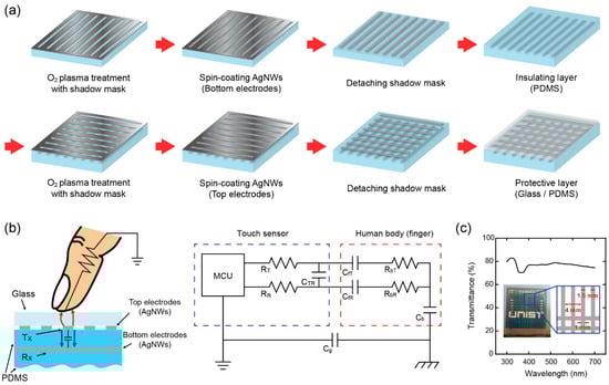 The non-lithographic fabrication procedures of capacitive TSP [13,26] are shown in Figure 1a. First, a polydimethylsiloxane (PDMS) film is spin-coated on a Si wafer at 200 rpm for 60 sec and baked in an oven at 100 °C for 20 min to make a ~300 μm thick soft substrate. After being detached from the Si wafer, the surface of PDMS substrate is then treated selectively with O2 plasma while being covered by a pre-patterned shadow mask. The O2 plasma treatment is performed with the power of 100 W and the gas flow of 50 sccm for 5 min. The shadow mask has line openings of ~1 mm width through which the PDMS surface is exposed to the O2 plasma. With this process, the PDMS surface exposed to O2 plasma is converted from hydrophobic to hydrophilic. Then, silver nanowires (AgNWs) dissolved in deionized (DI) water will be adhered selectively only on the converted (hydrophilic) area of PDMS surface so that AgNW electrode patterns can be formed without any lithography processes. On the PDMS surface treated with O2 plasma, an AgNW solution film is spin-coated at 300 rpm for 15 sec and baked on a hot plate at 105 °C for 10 min to dry off water and form the bottom electrode lines. On top of the AgNW bottom electrode lines, another PDMS film is spin-coated by following the procedures identical to those utilized for the PDMS substrate. This PDMS film takes a role of an insulating layer separating top and bottom electrodes. As performed previously for the PDMS substrate, the surface of PDMS insulating layer is exposed to O2 plasma while being covered with the shadow mask to induce line-shape hydrophilic regions. Then, the top electrode lines are formed on the hydrophilic regions by spin-coating an AgNW solution film and baking it in the same way as for the bottom electrode lines. Finally, a protective layer, either glass or PDMS film, can be attached for preventing potential physical damages given to the AgNW top electrode during repeating finger touch.