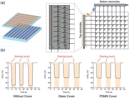 (a) Schematic view of electrode/circuit configuration of TSP for touch sensing mode and (b) capacitance change with finger touch for the three different cases of cover layer (no, glass, polydimethylsiloxane (PDMS)).