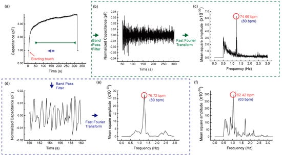 (a) The time trend of capacitance measured for heart-rate sensing without cover layer. The green dotted-line encloses the signal processing results for the oscillatory part of measured capacitance within the time interval of ~250 sec and the blue dotted-line encloses the corresponding results for the time interval of ~10 sec. (b,d) show the normalized capacitance after going through band pass filtering (0.5–3.0 Hz) and (c,e) show the frequency spectrum obtained with the subsequent fast Fourier transformation (FFT), (f) is the frequency spectrum of the capacitance signal measured for a different person which results from the same signal processing procedures.