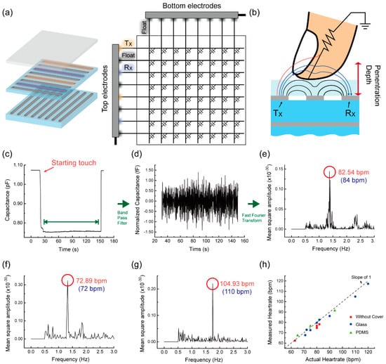 Figure 5c shows the mutual capacitance signal measured between the non-adjacent TX and RX. Here, the measured capacitance was found to decrease overall with finger touch, differently from the adjacent TX and RX case with no protective layer (Figure 4a). Since the dielectric constant of glass is ~5 times larger than that of air, the effective dielectric constant between TX and RX is already pretty large. Hence, the relative increment of effective dielectric constant due to the finger will be smaller than the case of no protective layer. In this case, the electric field loss to the finger can be more dominating and lead to the capacitance decrease. Nonetheless, the clear oscillation in the measured capacitance was still observed, indicating the cyclic modulation of the dielectric constant of finger synchronized with heart beats. As done previously, the 0.5–3.0 Hz of band pass filtering (Figure 5d) and FFT (Figure 5e) were performed. The oscillation amplitude was estimated to be ~3 fF. In the frequency spectrum, a clear peak was observed at ~82.54 bpm while the heart-rate counted on the wrist was 84 bpm. The heart-rate was measured under several different circumstances including multiple persons and their breathing condition (before and after physical exercise). Figure 5f,g are such examples where the closeness of the heart-rate from the capacitance measurements and that from the direct counting on the wrist can be seen clearly again. As an alternative protective layer, we also tested a ~300-μm-thick PDMS layer and the heart-rate extracted from capacitance measurements matched well with the directly-counted one. More details associated with the PDMS protective layer can be found in Supplementary Materials (Figure S1). Figure 5h shows that the correlation between capacitively-measured and directly-counted heart-rate, covering all three cases of no protective layer, glass protective layer, and PDMS protective layer, almost approaches the ideal case (slope of 1). This implies that the procedures presented in our work can be an efficient and reliable solution to measure the heart-rate with a conventional capacitive type TSP.
