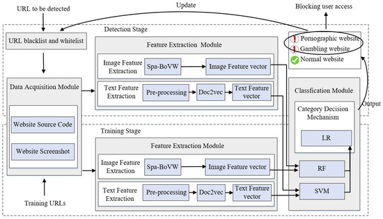 Figure 2 presents the internal process and framework of the proposed system. Given a URL to be detected, the proposed system first compares this URL with the URL blacklist and whitelist libraries. If the URL already exists on the URL blacklist or whitelist library, the system identifies the website category directly without further content analysis. This step can greatly save the detection time of the system. After the blacklist and whitelist screening, for the detection of unknown URLs, the proposed web content filtering system will perform the following steps: (1) access the URL and then obtain the website source code and website screenshot of the corresponding website via web crawling and scrapping; (2) extract the textual and image features from website source code and website screenshots, respectively; (3) use the corresponding classifier to make preliminary predictions for these two types of features; (4) employ the decision mechanism to judge and output the final website category and then add this URL to our URL blacklist or whitelist for updating. For simplicity, the proposed framework is divided into three main processing modules, as follows: