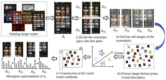 To improve this situation, we integrated the local spatial relationship of the website screenshots into the BoVW model, proposing Spa-BoVW. The process of the image (website screenshots) representation using the Spa-BoVW is shown in Figure 3. The proposed Spa-BoVW divides the screenshot of the website into four sub-image blocks and considers the spatial relationship between the visual feature points among the four sub-blocks to capture more visual information. Furthermore, the inverse document frequency (IDF) was introduced to reduce the interference caused by visual stop words, which is beneficial for achieving more accurate and effective image feature representation. The specific implementations of image representation based on the Spa-BoVW model are as follows: