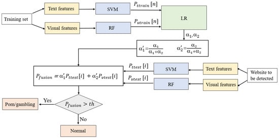 This module combines multiple machine learning models for classifying the given website. Based on the textual and visual features obtained in the feature extraction module, an SVM and a random forest (RF) are used as the text classifier and image classifier to classify the given website, respectively. Then, the category decision mechanism fuses the classification results of the two classifiers (SVM, RF) by using a fusion algorithm based on LR and produces a final prediction concerning the category of the website. Finally, based on the predicted website category, the system’s URL blacklist and/or whitelist is updated.