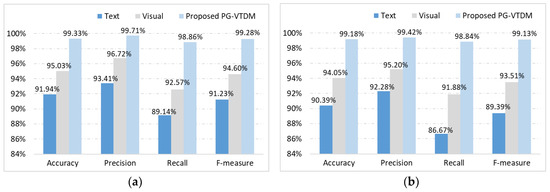 Figure 5. Performance comparisons between the single-feature-detection methods and the proposed PG-VTDM: (a) pornographic websites dataset and (b) gambling websites dataset.