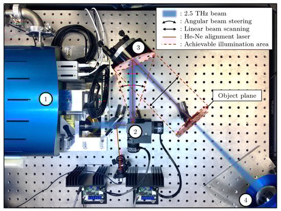 Experimental imaging setup, implementing (1) the Teracascade1000 QCL source, from Lytid, emitting 1.3 mW at 2.5 THz, (2) the double mirror galvanometer, (3) a 45 off-axis parabolic mirror and (4) the INO 288 × 384 microbolometer array with an aspherical f/0.8 addapted silicon lens, Teralens from Lytid.