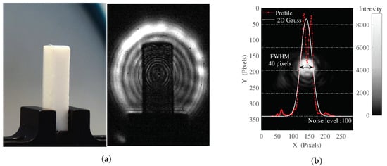 In this newly introduced illumination system, the beam itself is strongly impacted by this light source coherence characteristic as well, as depicted in Figure 2b, where an image, a beam profile cut and the related 2D Gaussian fit profile are plotted, resulting in an estimated FWHM H = 40 pixels, mm in the imaging plane, or mm in the object plane.