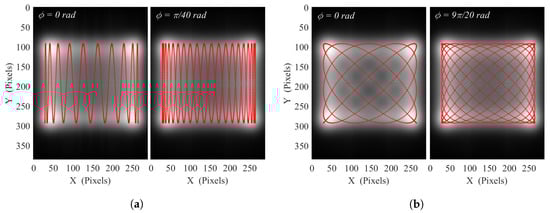Figure 3 displays, for A = B = , and the two relative phase values = 0 (degenerated pattern) and = (optimum spatial coverage), the simulations of two suitable distinct investigated patterns with (a) at Hz, Hz, mimicking a smoothed sinusoidal raster-scanning illumination method, and (b) at Hz, Hz, depicting a less intuitive pattern. To simulate the terahertz illumination on the sensors array, the 2D Gaussian function from the still mode image (Figure 2b) is averaged on every positions of the closed Lissajous path way in the image plane, considering the x0.22 lens magnification factor. The simulation spatial resolution is set to be the 35 m array pitch. The temporal resolution is set to 50 s for proper scanning sampling while a duration of 160 ms for = 20, and 80 ms for = , ensures to complete the closed Lissajous curve scan for any relative phase . The animated pattern constructions, for those , and various FWHM can be visualized in the Supplementary Materials (Video S2).
