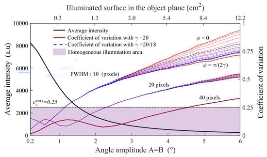 In the ideal case of a perfectly homogeneous illumination, such as for single point raster-scanning, the coefficient of variation is equal to 0. This reference imaging method displays very weak signal variations, mainly induced by the source and detector noise, with typical 70 dB measurement dynamics. Considering a square command , Figure 4 displays, for a given Lissajous coefficient value, the simulated evolution of the average intensity (left axis) and the heterogeneity criterion, (right axis) as a function of the angular amplitude from 0.2 to 6. The corresponding illuminated surface in the object plane is also given for six different amplitude angles, ranging from 0.3 to 12.2 cm. In addition, is calculated for varying relative phases from 0 to , as well as for three beam FWHM of 10, 20 and 40 pixels, corresponding to the following beams diameters in the object plane: 1.6, 3.2 and 6.4 mm respectively.