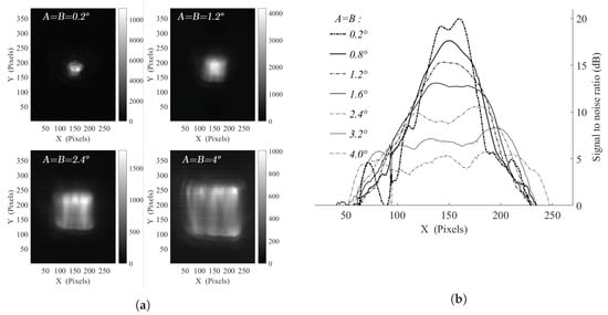(a) Experimental illumination characterisations for γ = 20 with Fx = 6.25 Hz, Fy = 125 Hz and varying A = B = 0.2°; 1.2°; 2.4°; 4.0° illumination patterns; (b) SNR level evolution profiles along horizontal direction as a function of the driving amplitude for the generation of square patterns from A = B = 0.2° to 4.0°.