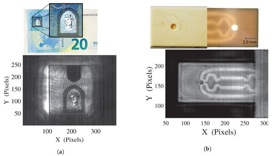 (a) Transmission image of a 20€ bill holographic strip at 2.5 THz, (b) Photograph, optical transmission image and 2.5 THz absorbance image of a 3D printed alumina-based ceramic micro-fluidic chip.