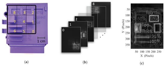 (a) Picture of the high density polyethylene sample with visualization of the sub-illuminated areas, (b) stack of the unprocessed recorded transmission sub-images at 2.5 THz, (c) absorbance reconstructed multi-exposure image.