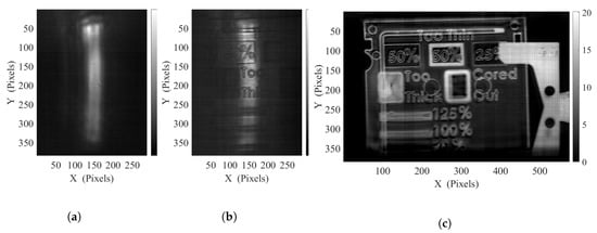 In this implementation, the same HDPE sample presented in Figure 7a has been investigated on the same setup. A full width illumination of the sensor have been achieved for this unidirectional lighting, with B = and A = and with an oscillating frequency of Hz. The Figure 8a,b, represents respectively the unidirectional background illumination and a given frame of the object scan. The unidirectional oscillation set to the galvanometer ensures a faster pattern repetition rate, providing a faster accessible frame rate, set to 25 FPS (averaging factor of 2) for this measurement, allowing an object displacement at the speed of 20 mm s and so a measurement time under 4 seconds for the full sample scan. Reminiscent coherence artifacts remain noticeable in the vicinity of the edges as well as on the side of the illumination patterns due to the more regular nature of this displacement scheme. Nevertheless, for the object reconstruction, only the homogenized part of the pattern is considered. The video-rate displayed linear scanning can be visualized in the Supplementary Content S4, while the resulting object reconstruction is given in Figure 8c.
