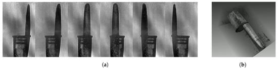 (a) Selection of 6 cropped and centered 2D projections of the sample among the 36 acquired from 0° to 175° (b) 3D isometric visualization of the pen cap reconstructed by terahertz computed tomography.