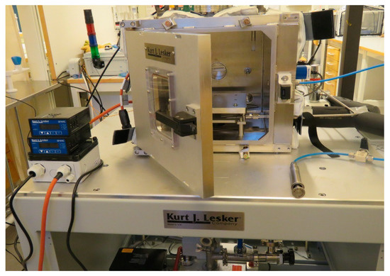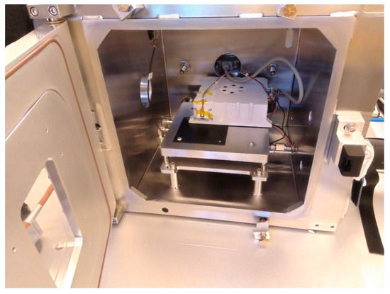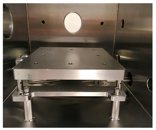 The dimensions of the cooling plate (Figure 3) are 200 mm × 200 mm × 18 mm, and it has an inbuilt thin pipe for liquid nitrogen (LN2). The temperature of the surface is controlled by passing liquid nitrogen from a Dewar using a feedthrough. The temperature control is performed by a proportional integral differential (PID) controller, which is in a feedback through a PT100 sensor allowing the solenoid valve to open and permit the flow of liquid nitrogen. We monitor the temperature of the working plate connected to a K-type thermocouple located on the left wall of the chamber. The temperature of the samples inside the chamber can be reduced up to 163 K.
