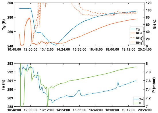 We simulate the environmental conditions that occur on Mars during the transition from nighttime (when due to the low temperature the surface humidity reaches its highest value and may saturate) to daytime (when the surface temperature increases releasing the water to the atmosphere). The simulation is done by evacuating the air in the SpaceQ chamber with a rotary pump down to 10−3 mbar and replacing it by carbon di oxide (CO2) gas to 6–8 mbar, which is a representative range of the average atmospheric pressure on Mars. A Pirani gauge reader monitors this. Once the CO2 gas stabilizes, we inject water using the Swagelok stainless steel syringe and then use liquid nitrogen (LN2) to cool the working table down to 250.15 K. This whole process of achieving close to Martian condition takes about 1 h, and the tests are done with pure CO2 gas and minute amounts of water. When water is injected, the relative humidity within the chamber changes depending on the temperature. There are unavoidable thermal gradients, which occurs when the table is refrigerated with LN2, and the external walls of the chamber are warm due to the contact with the ambient laboratory temperatures. For this specific setup, the relative humidity (RH) probe monitors the air relative humidity with respect to liquid at roughly 10.2 cm above the table and 5.2 cm from the sidewalls. Figure 4 shows an example of a simulation from a Martian night-to-day transition. The ground temperature (Tg) and air temperature (Ta), the relative humidity of the air (RHa), and pressure (P) are directly measured, whereas the relative humidity of ground with respect to ice and liquid (RHgi and RHgl) are derived by using the formulae (1)–(4) [19].